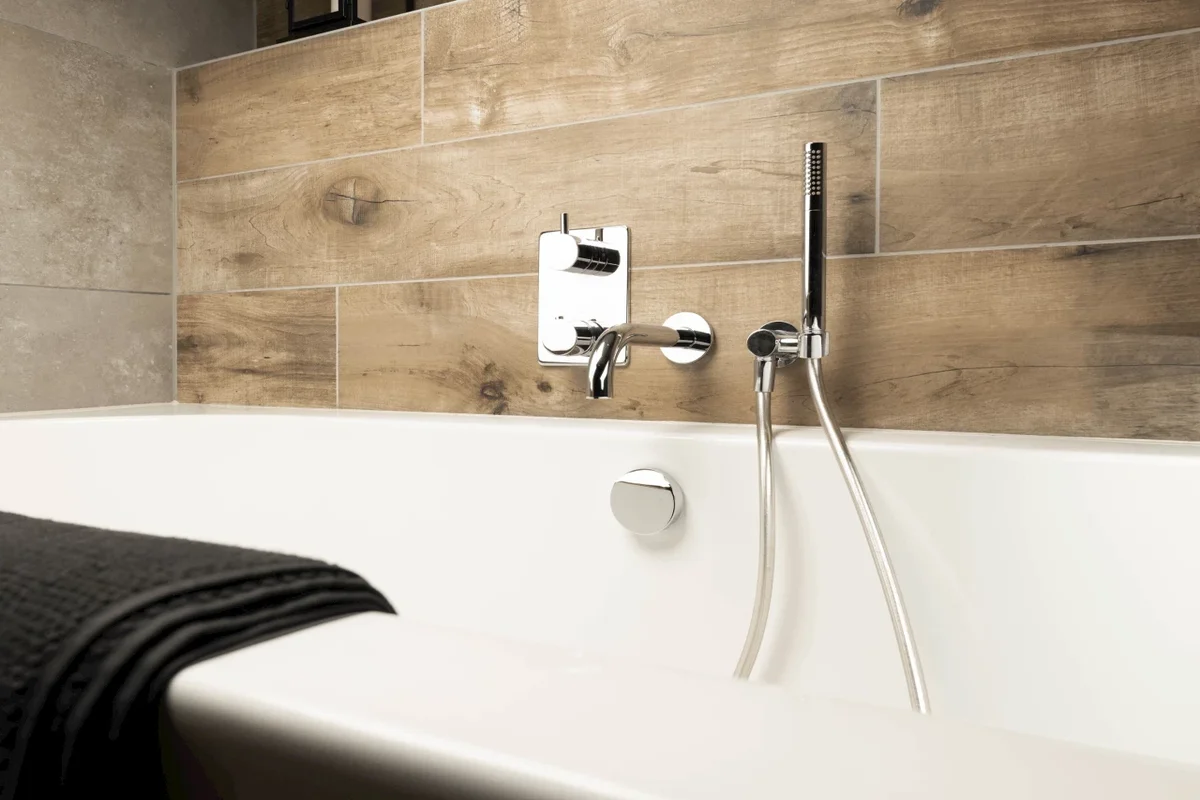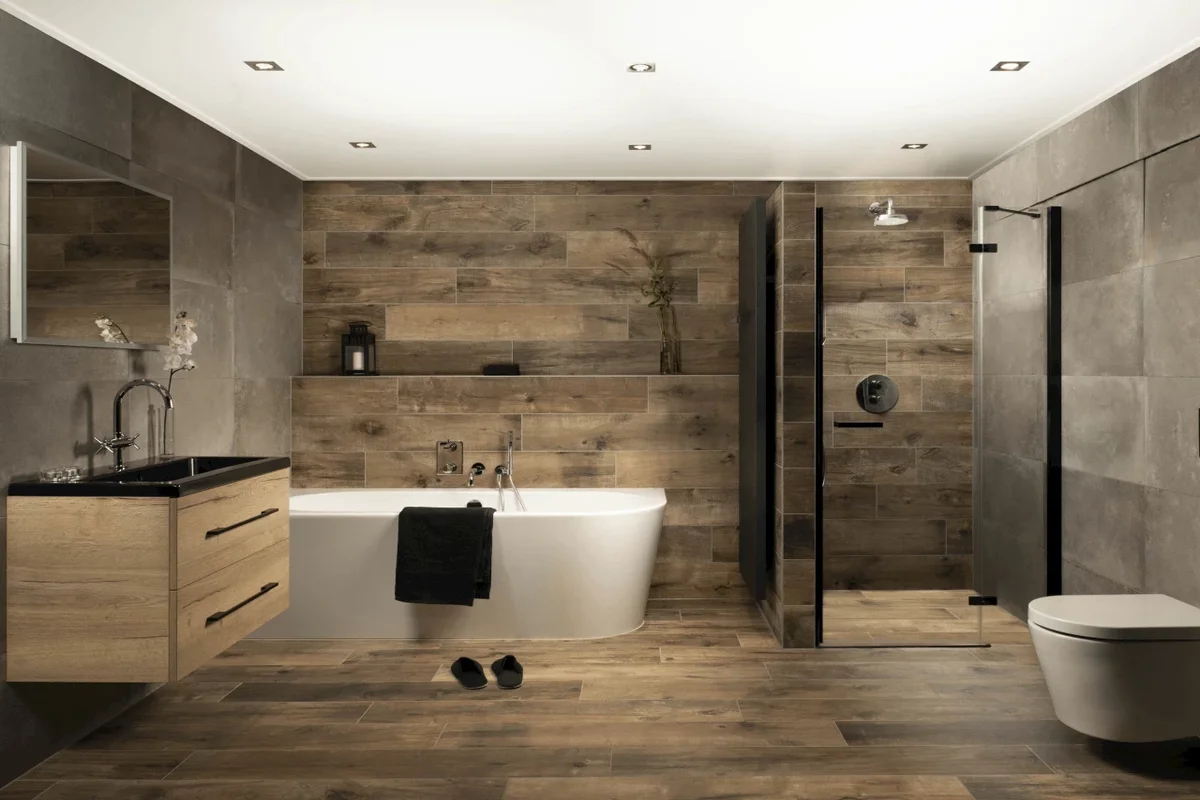 The complete Winter Wood bathroom is a warm and inviting space, equipped with high-quality products. This modern bathroom takes its name from the warm wood tones combined with the gray tiles and black trim. Discover all about this bathroom below.
