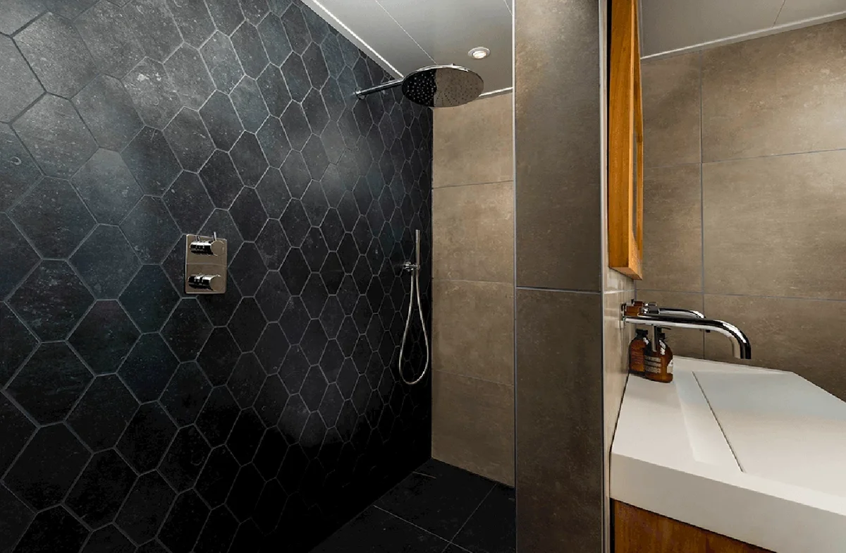 The complete Loft bathroom is a luxurious space with plenty of black elements. A truly trendy bathroom! The black elements, combined with the beautiful decorative floor tiles, create a luxurious look!