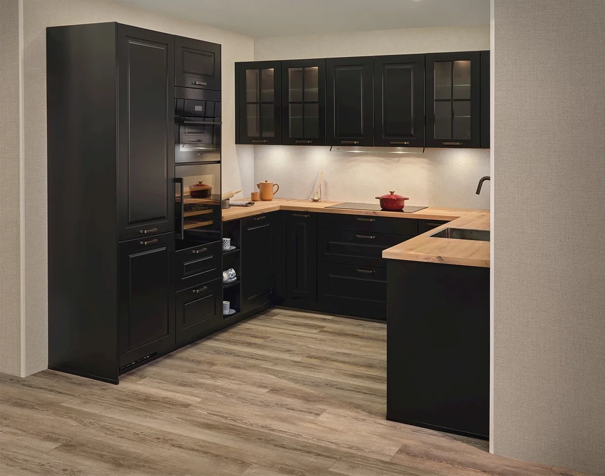 Looking for a country kitchen with a classic look? Then the complete Sylt Black kitchen is perfect for you. The window fronts, glass cabinets, and classic handles create a nostalgic atmosphere.