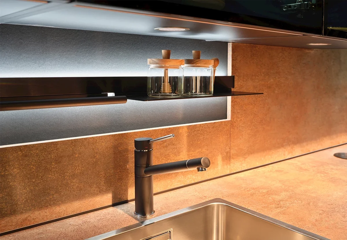 Looking for a stylish kitchen with a concrete look? Then the complete Riva Terra Concrete kitchen might be just what you're looking for. Despite its dark color, it doesn't look dark at all. This is thanks to the LED lighting above the kitchen and countertop.