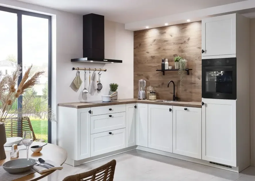 De complete Nordic White keuken is dankzij de combinatie van lichte kleuren en het natuursteenlook werkblad een echte landelijke keuken. De keuze voor fronten met raamlook geeft de keuken een klassieke uitstraling.