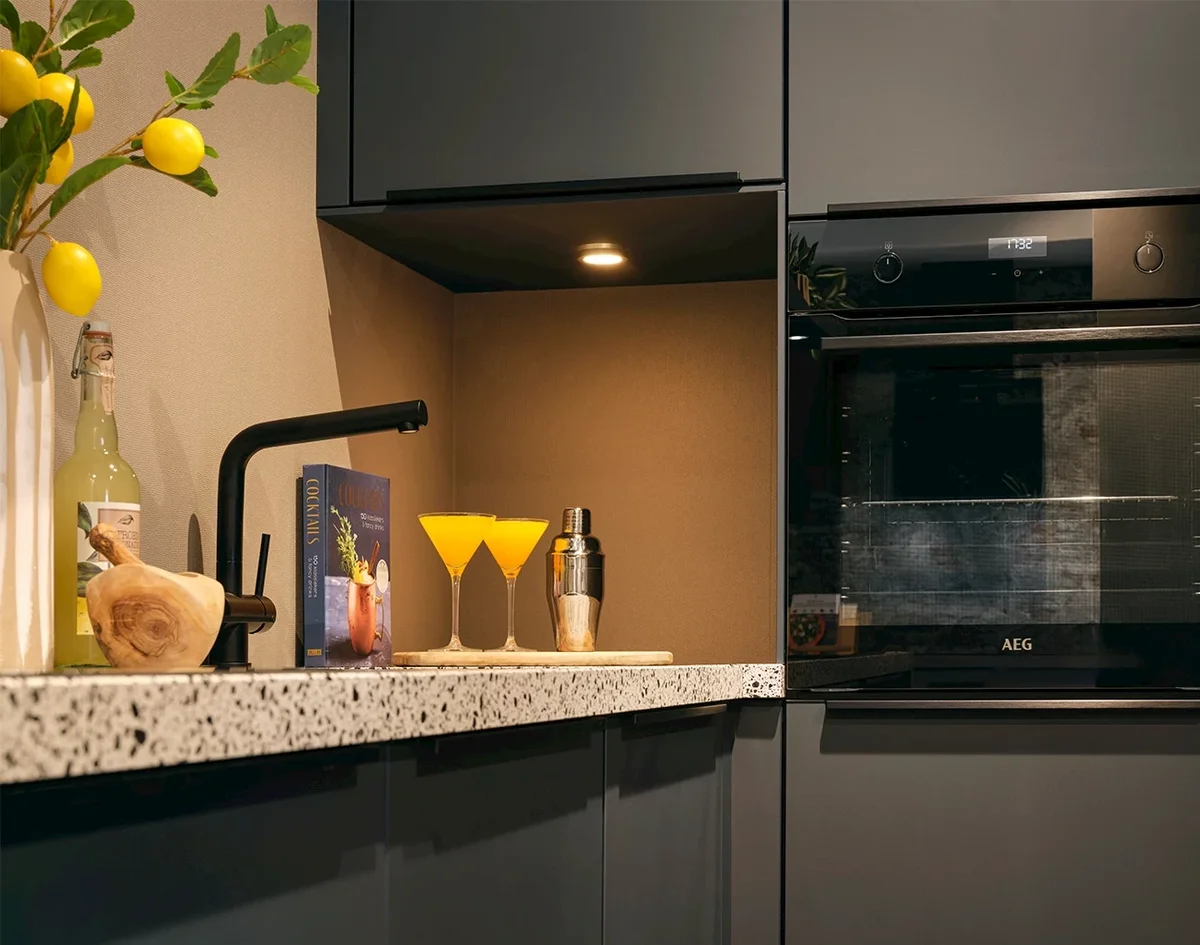Onze complete Touch Black keuken creëert dankzij de combinatie van donkere kleuren een warme en uitnodigende sfeer. Deze uitnodigende uitstraling wordt nog eens versterkt door de keukenbar op het schiereiland!