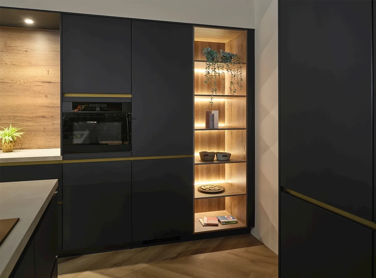 De complete Deepblue keuken is een stijlvolle keuken met een luxe uitstraling. De unieke combinatie van diepblauwe fronten en gouden accenten geeft de keuken een luxe uitstraling. De houtlook fronten zorgen voor een rustgevend contrast.