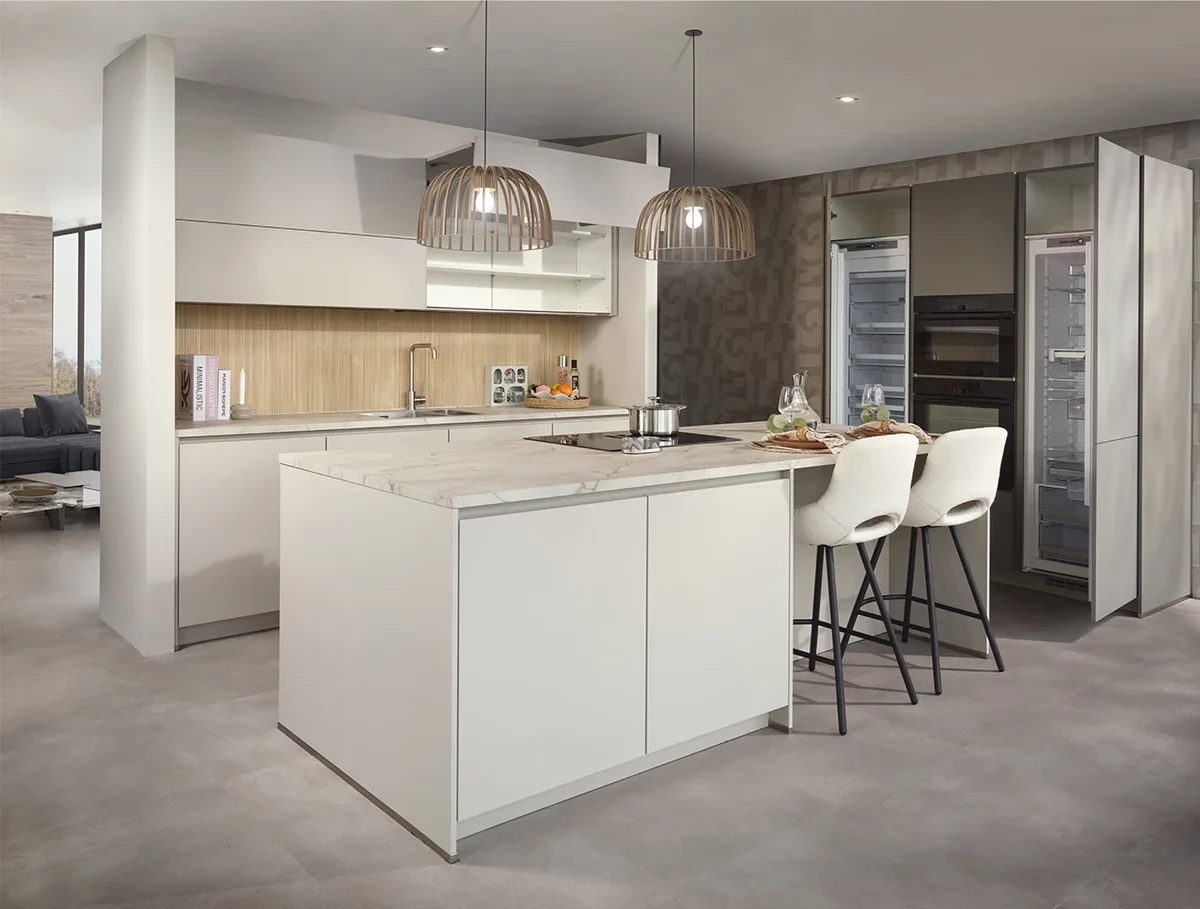 Ben je op zoek naar een ruime keukenopstelling met voldoende ruimte om heerlijke gerechten te bereiden? Dan is de complete Decor Concrete White keuken perfect voor jou. Deze keuken biedt ook zitgelegenheid en een bar om aan te eten.