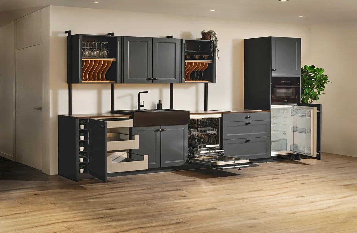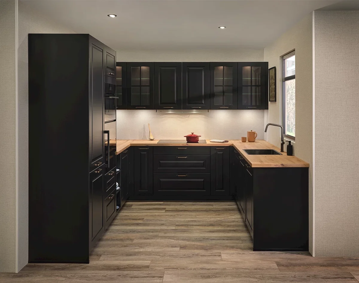 Zoek je een landelijke keuken met een klassieke uitstraling? Dan is de complete Sylt Black keuken perfect voor jou. De raamfronten, glazen kasten en klassieke handgrepen zorgen voor een nostalgische sfeer.